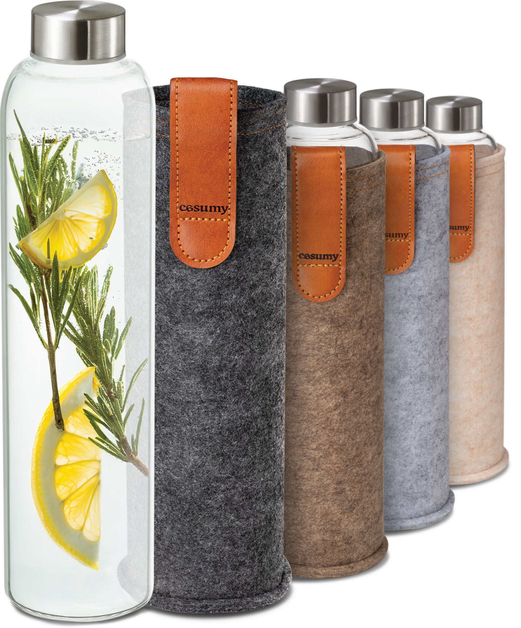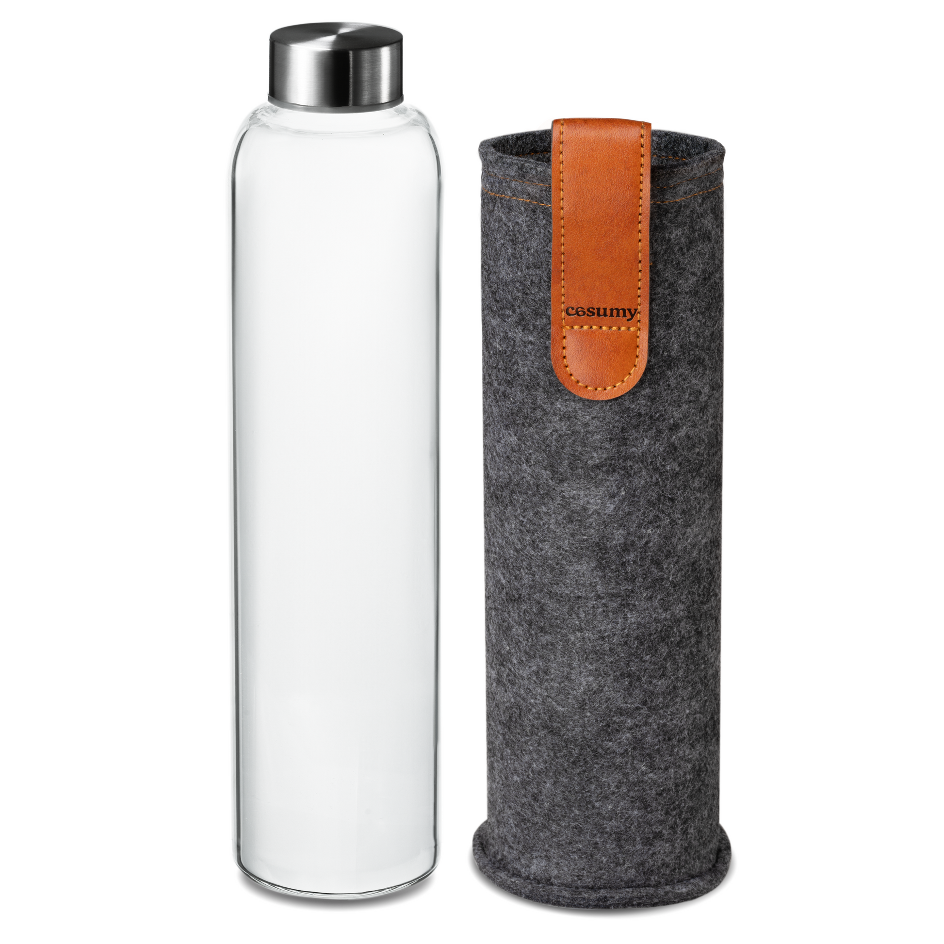 Die Cosumy Trinkflasche aus hitzebeständigem Borosilikatglas mit natürlicher Filzhülle begleitet dich sanft durch den Tag. Mit 750 ml Fassungsvermögen bietet sie Platz für dein Lieblingsgetränk oder frisches Wasser, während die Filzhülle schützt, isoliert und angenehm in der Hand liegt.
