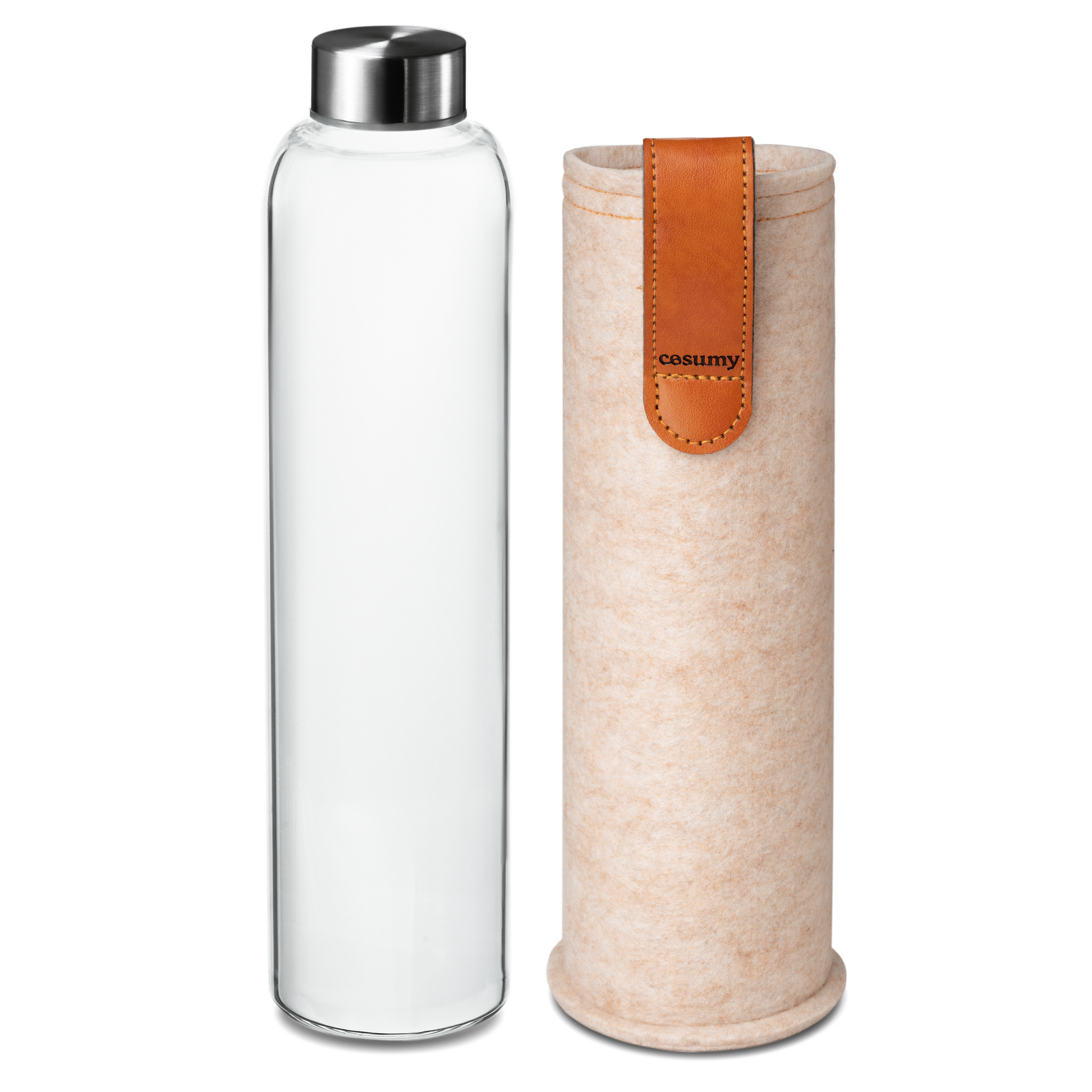 Die Cosumy Trinkflasche aus hitzebeständigem Borosilikatglas mit natürlicher Filzhülle begleitet dich sanft durch den Tag. Mit 750 ml Fassungsvermögen bietet sie Platz für dein Lieblingsgetränk oder frisches Wasser, während die Filzhülle schützt, isoliert und angenehm in der Hand liegt.